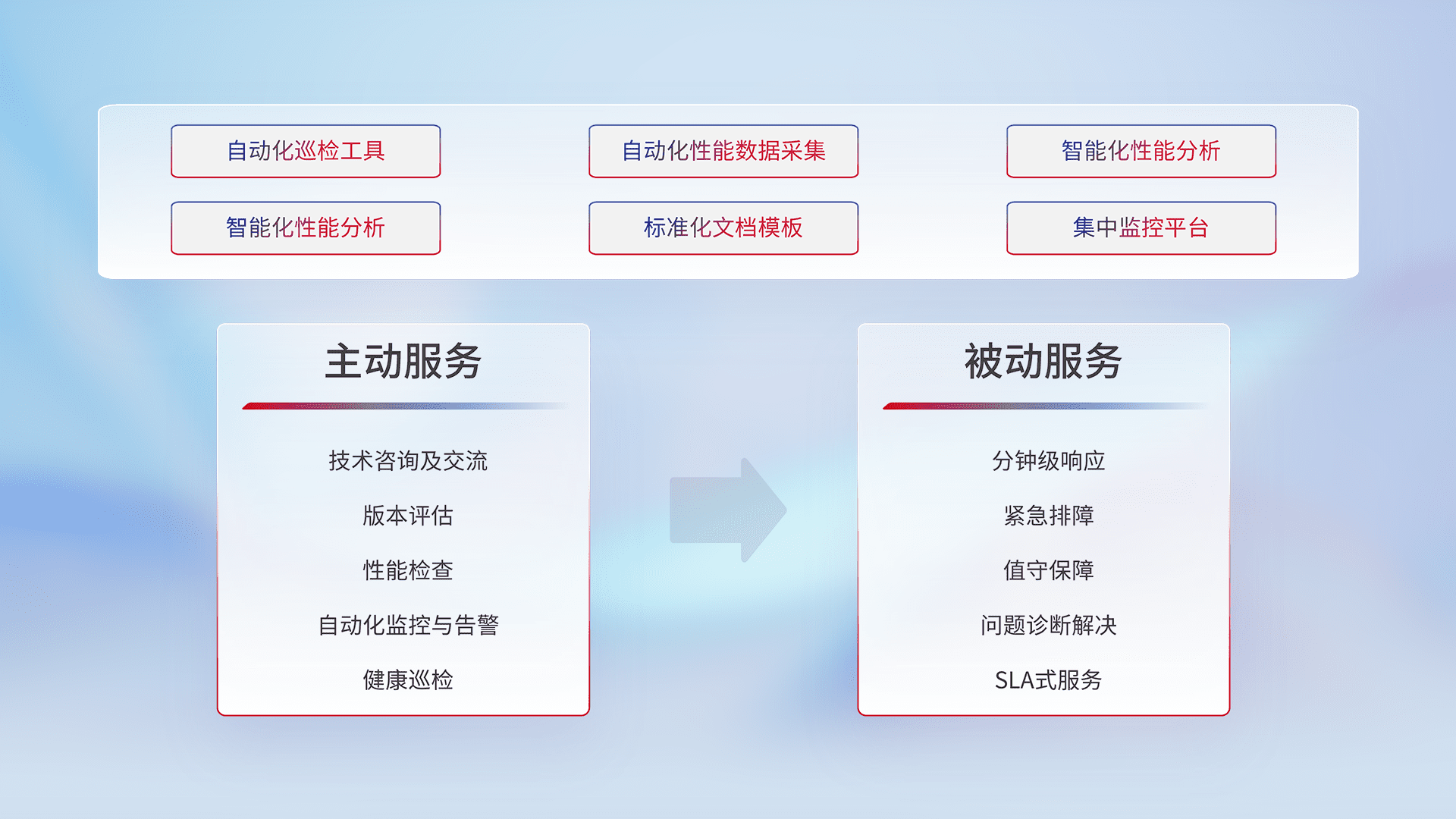 智能化工具和标准化文档,,,,保障服务质量,,,提供主动服务(包含技术咨询、、、版本评估、、性能检查、、自动化监控与告警、、、健康巡检)和被动服务包含(分钟级响应、、、、紧急排障、、、值守保障、、、、问题诊断解决、、SLA服务)。。。